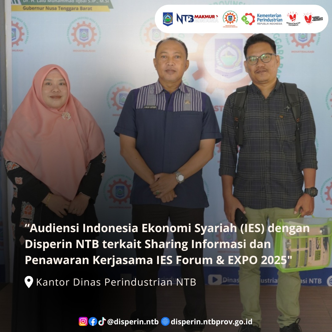 Audiensi ini bertujuan untuk menyampaikan informasi pelaksanaan Indonesia Ekonomi Syariah (IES) Forum & Expo 2025 yang direncanakan berlangsung pada : Tanggal : Jumat – Minggu, 24 – 26 Oktober 2025 Tempat : Islamic Center Kota Mataram, Nusa Tenggara Barat serta menjajaki peluang kerjasama strategis antara pihak IES dan Dinas Perindustrian NTB, khususnya dalam mendukung penguatan ekosistem ekonomi syariah melalui sektor industri, UMKM halal, dan pemberdayaan masyarakat berbasis syariah.