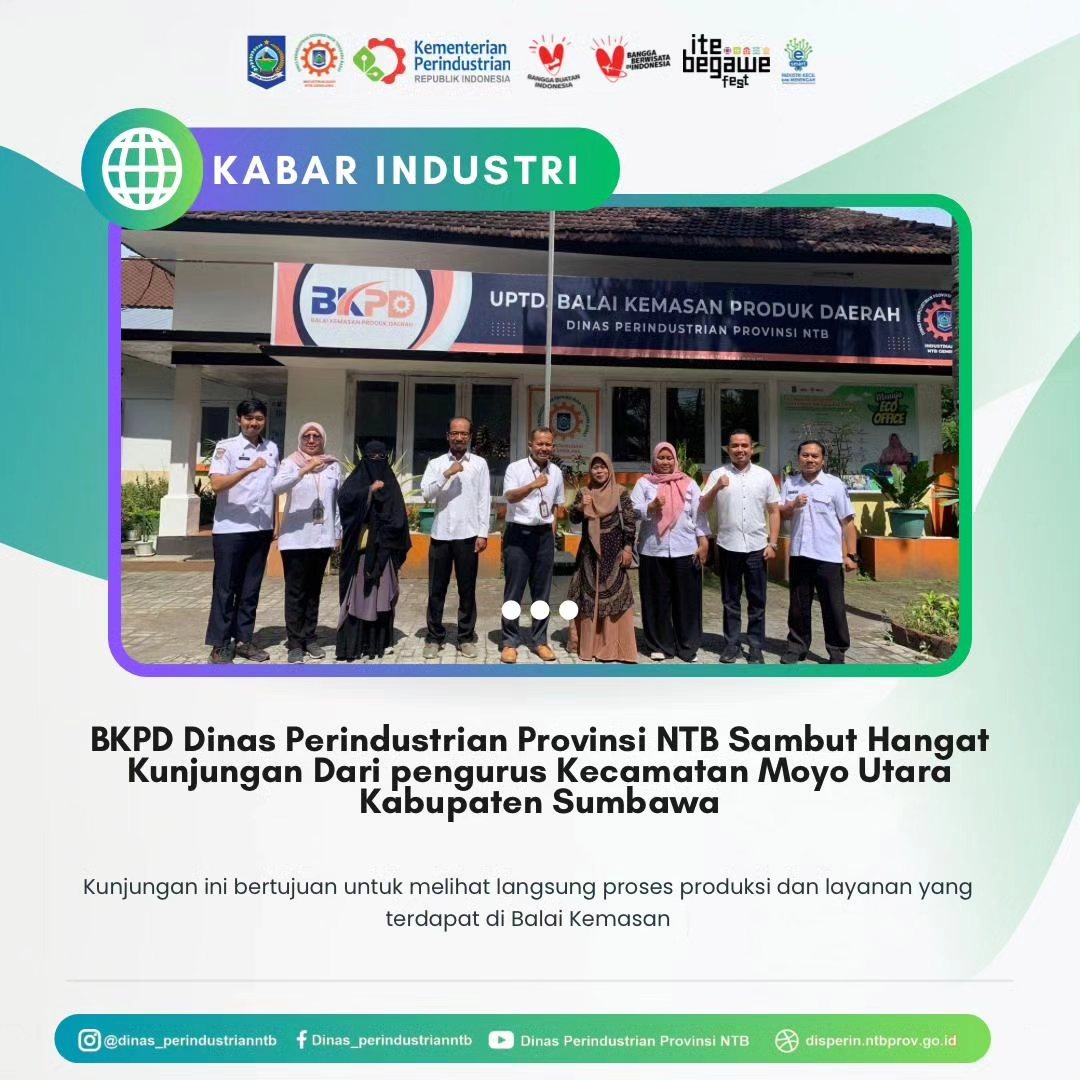 Kunjungan silaturahmi dari pengurus Kecamatan Moyo Utara Kabupaten Sumbawa, Yeni Karmawati dan tim ke Balai Kemasan Produk Daerah Dinas Perindustrian Provinsi NTB disambut hangat Kepala Balai Kemasan, Drs. Agus Supriyanto, Apt beserta jajaran pada Rabu, 10 Juli 2024.