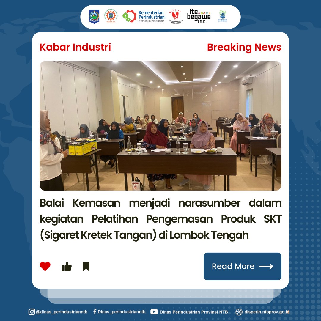 Mewakili Kepala Balai Kemasan Produk Daerah Dinas Perindustrian Provinsi NTB, Staf UPTD Balai Kemasan Produk Daerah menjadi narasumber dalam kegiatan Pelatihan Pengemasan Produk SKT (Sigaret Kretek Tangan) di JM Hotel Lombok Tengah pada 26-29 Agustus 2024. Kegiatan yang berlangsung 3 hari diawali dengan membahas pentingnya kemasan dan fungsi kemasan bagi produk. Dihari kedua kegiatan diisi dengan materi desain kemasan dan pengenalan alat pengemasan sederhana yaitu sealer. Pada hari ketiga dijelaskan terkait branding produk dan penerapan filosofi kaizen serta stimulasi kaizen.