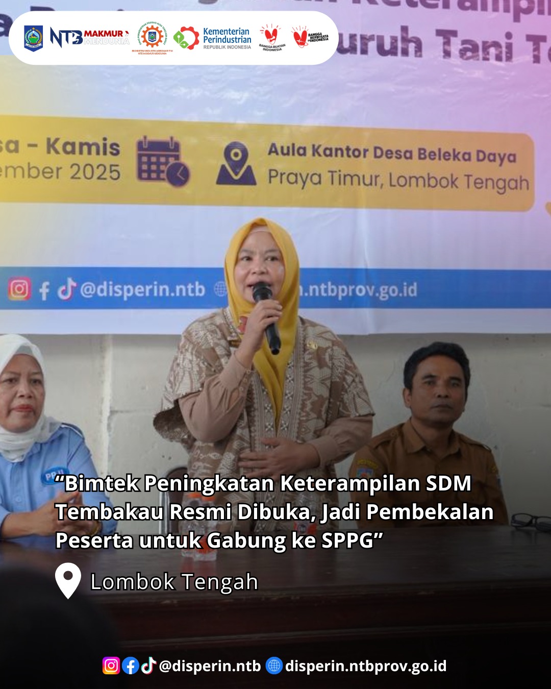Lombok Tengah, Selasa 25 November 2025 — Kepala Dinas Perindustrian Provinsi NTB, Hj. Nuryanti, SE., ME., membuka secara resmi Bimbingan Teknis (Bimtek) Peningkatan Keterampilan Sumber Daya Manusia bagi petani dan buruh tani tembakau. Kegiatan berlangsung selama tiga hari dengan jumlah peserta 30 orang dari wilayah sentra tembakau.