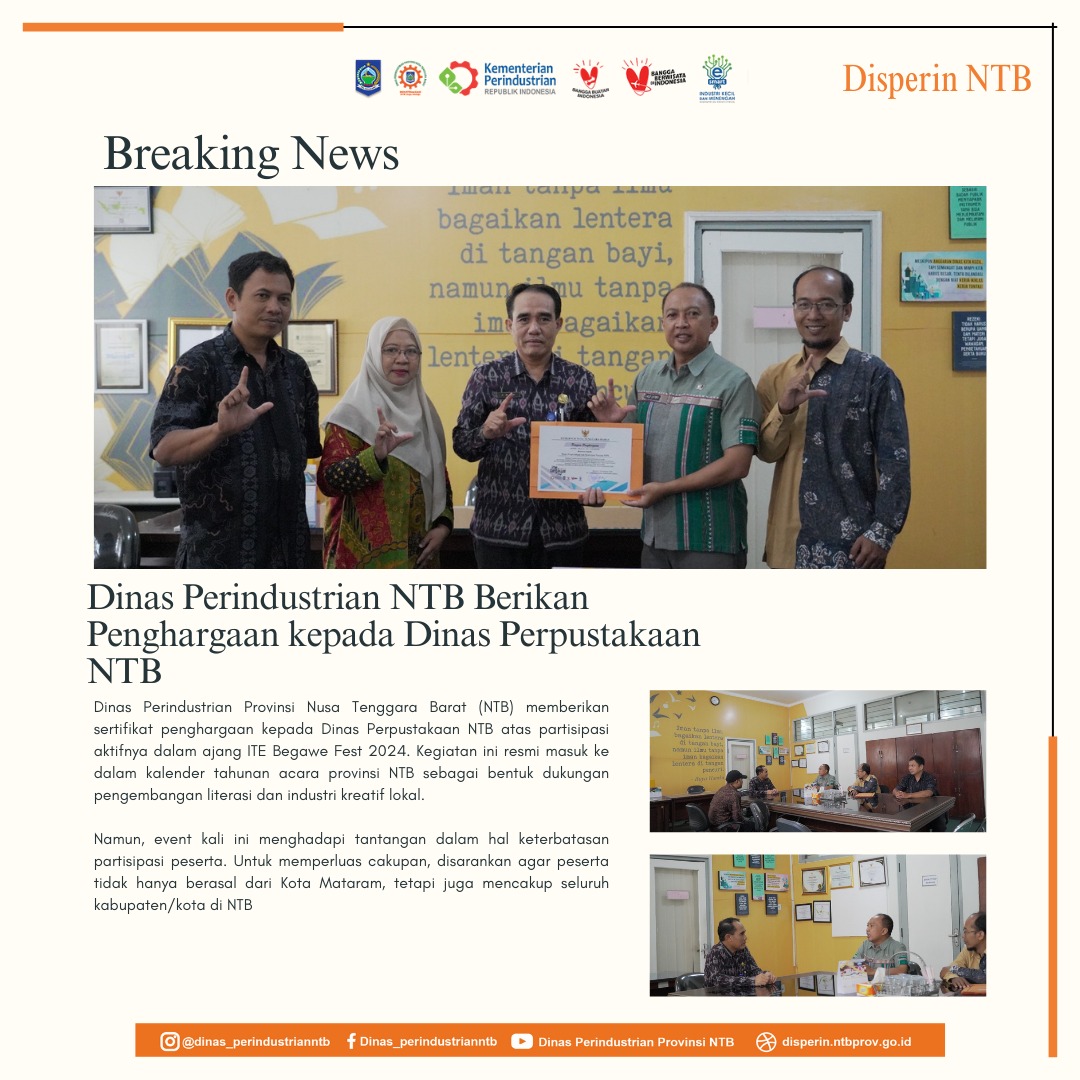 Dinas Perindustrian Provinsi Nusa Tenggara Barat (NTB) memberikan sertifikat penghargaan kepada Dinas Perpustakaan NTB atas partisipasi aktifnya dalam ajang ITE Begawe Fest 2024. Kegiatan ini resmi masuk ke dalam kalender tahunan acara provinsi NTB sebagai bentuk dukungan pengembangan literasi dan industri kreatif lokal.