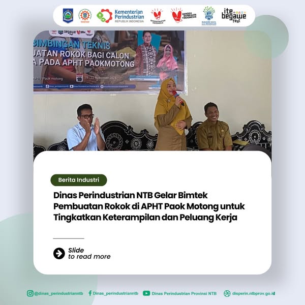 Lombok Timur, 19 November 2024 – Dinas Perindustrian Provinsi Nusa Tenggara Barat (NTB) menyelenggarakan Bimbingan Teknis Pembuatan Rokok bagi Calon Pekerja di Aglomerasi Produk Hasil Tembakau (APHT) Desa Paok Motong, Kecamatan Lombok Timur. Kegiatan yang berlangsung selama empat hari, mulai 19 hingga 22 November 2024, ini bertujuan untuk meningkatkan keterampilan calon tenaga kerja dalam industri hasil tembakau.