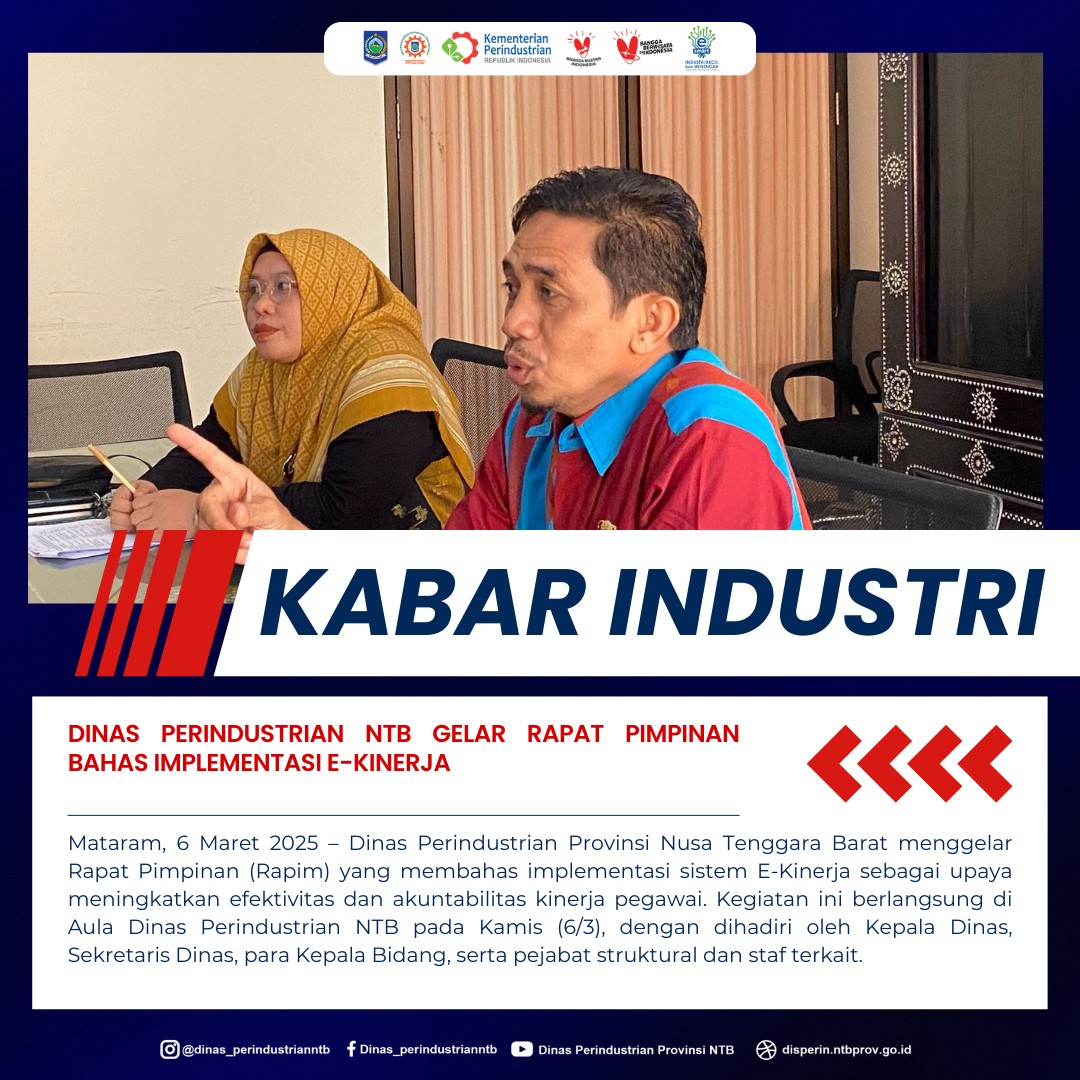 Mataram, 6 Maret 2025 – Dinas Perindustrian Provinsi Nusa Tenggara Barat menggelar Rapat Pimpinan (Rapim) yang membahas implementasi sistem E-Kinerja sebagai upaya meningkatkan efektivitas dan akuntabilitas kinerja pegawai. Kegiatan ini berlangsung di Aula Dinas Perindustrian NTB pada Kamis (6/3), dengan dihadiri oleh Kepala Dinas, Sekretaris Dinas, para Kepala Bidang, serta pejabat struktural dan staf terkait.