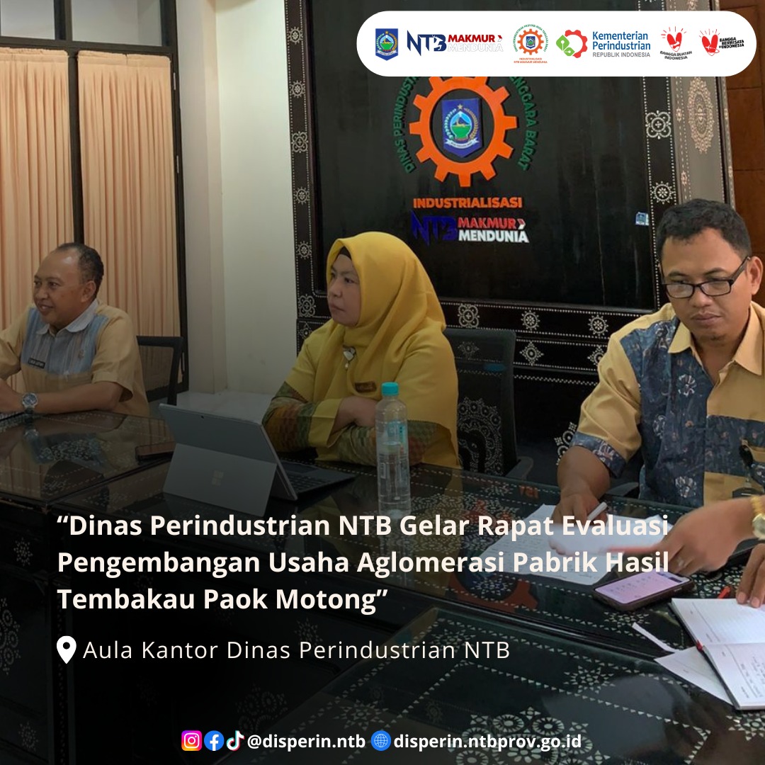 Rapat dipimpin oleh Kepala Dinas Perindustrian Provinsi NTB, Nuryanti, S.E., M.E., didampingi Sekretaris Dinas Lalu Luthfi, S.T., M.Si., bersama Tim Bidang Kerjasama dan Promosi Industri, bertempat di Aula Dinas Perindustrian Provinsi NTB.