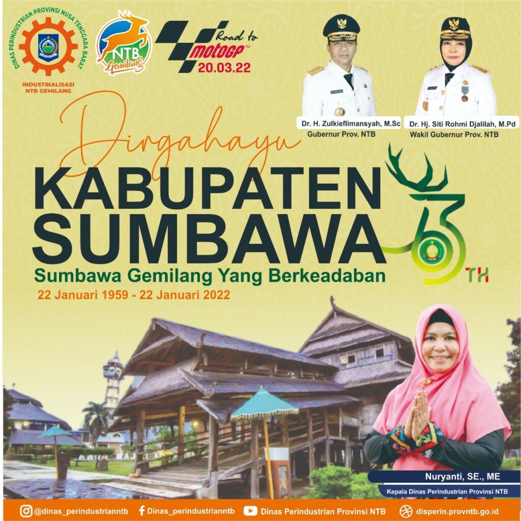Nuryanti SE., ME dan seluruh jajaran Dinas Perindustrian Provinsi NTB mengucapkan Dirgahayu Kabupaten Sumbawa.
