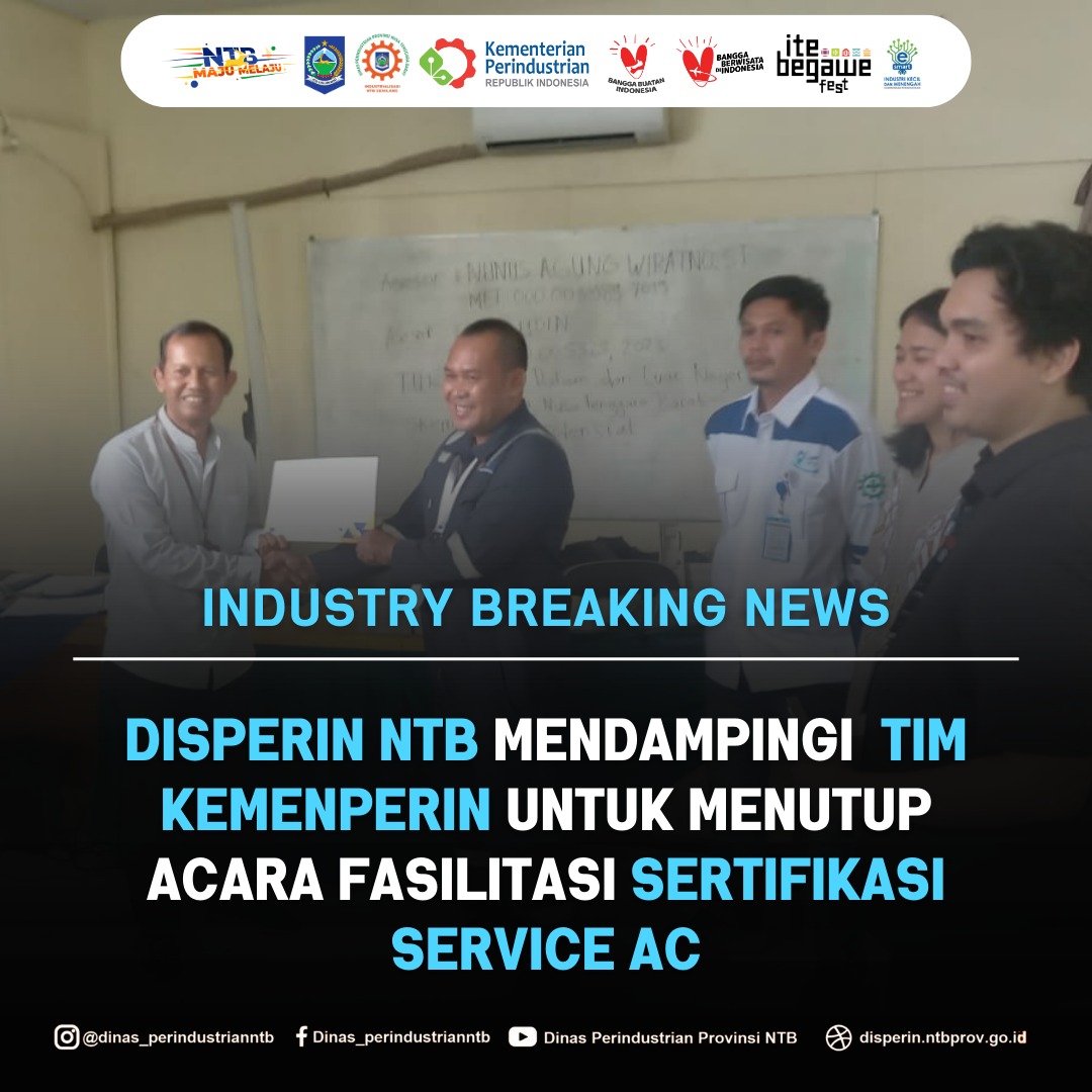 Jumat 28 Juni 2024, Mewakili Kepala Dinas Perindustrian Provinsi NTB, Kepala Balai Kemasan Produk Daerah Dinas Perindustrian Provinsi NTB ,Drs. Agus Apriyanto, Apt memberikan sambutan sekaligus mendampingi Tim Kemenperin untuk menutup acara Fasilitasi Sertifikasi Service AC di Provinsi Nusa Tenggara Barat.