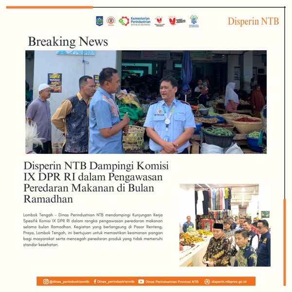 Lombok Tengah – Dinas Perindustrian NTB mendampingi Kunjungan Kerja Spesifik Komisi IX DPR RI dalam rangka pengawasan peredaran makanan selama bulan Ramadhan. Kegiatan yang berlangsung di Pasar Renteng, Praya, Lombok Tengah, ini bertujuan untuk memastikan keamanan pangan bagi masyarakat serta mencegah peredaran produk yang tidak memenuhi standar kesehatan.