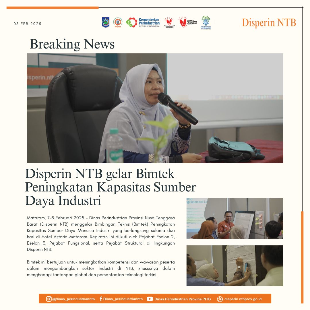 Mataram, 7-8 Februari 2025 – Dinas Perindustrian Provinsi Nusa Tenggara Barat (Disperin NTB) menggelar Bimbingan Teknis (Bimtek) Peningkatan Kapasitas Sumber Daya Manusia Industri yang berlangsung selama dua hari di Hotel Astoria Mataram. Kegiatan ini diikuti oleh Pejabat Eselon 2, Eselon 3, Pejabat Fungsional, serta Pejabat Struktural di lingkungan Disperin NTB.