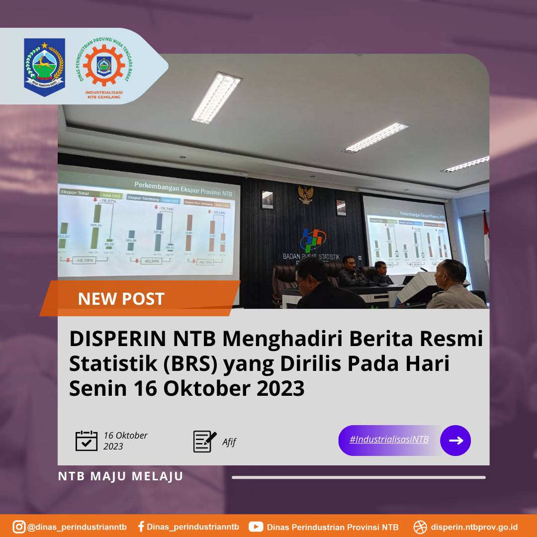 Tim Data Dinas Perindustrian Provinsi NTB Menghadiri Berita Resmi Statistik (BRS) yang dirilis hari ini, Senin, 16 Oktober 2023, jam 13.30 WITA oleh Kepala BPS Provinsi NTB, Drs. Wahyudin M.M dengan beberapa berita sebagai berikut: