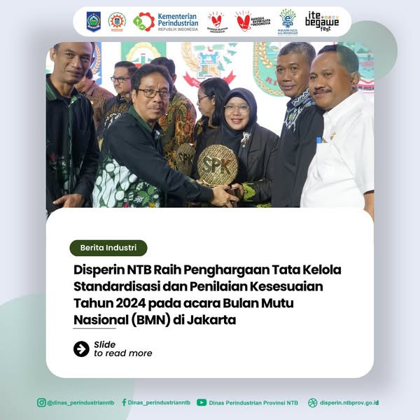 Badan Standardisasi Nasional (BSN) bersama dengan para pemangku kepentingan standardisasi dan penilaian kesesuaian kembali melaksanakan Bulan Mutu Nasional (BMN) yang telah diinisiasi sejak tahun 1991. Untuk itu, Kepala Dinas Perindustrian Provinsi NTB, dalam hal ini diwakili oleh Kabid Sarpras DR. Aryanti Dwiyani, S. Pt, M. Pd dan tim hadir pada kegiatan tersebut dengan tema yaitu Standardisasi Untuk Transformasi Ekonomi Berkelanjutan sekaligus menerima penghargaan terkait dengan Tata Kelola Standardisasi dan Penilaian Kesesuaian Tahun 2024 atas pencapaian Dinas Perindustrian Provinsi NTB pada Indeks Maturitas Tata Kelola SPK Level 2 pada penilaian yang sudah dilakukan oleh BSN beberapa waktu lalu.