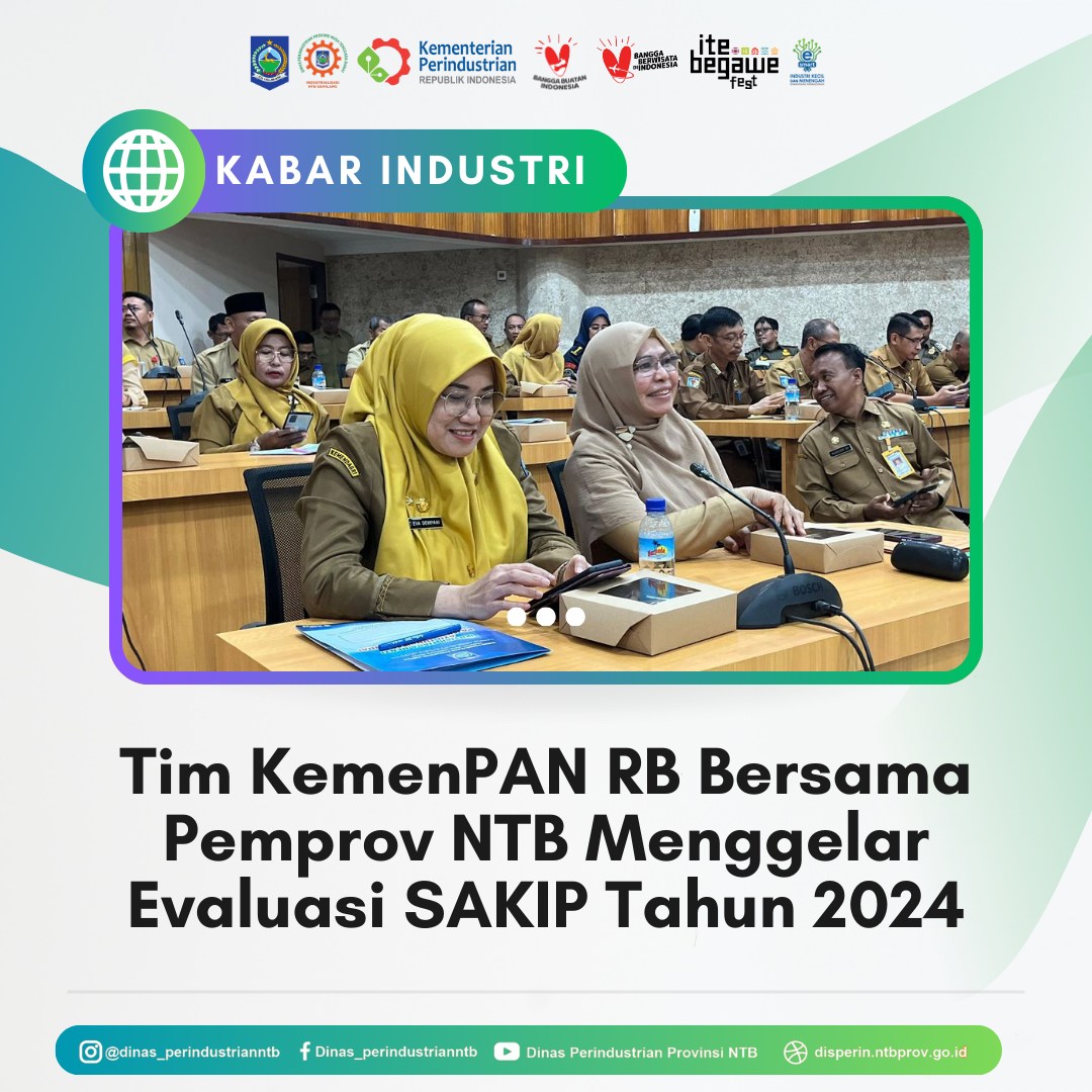 Selasa, 30 Juli 2024 Kepala Dinas Perindustrian NTB Nuryanti SE., ME dan tim sekretariat Disperin NTB Menghadiri evaluasi akuntabilitas kinerja instansi pemerintah (SAKIP) Provinsi NTB yang tujuannya guna memberikan penilaian atas perkembangan implementasi akuntabilitas kinerja instansi lingkup Provinsi NTB.