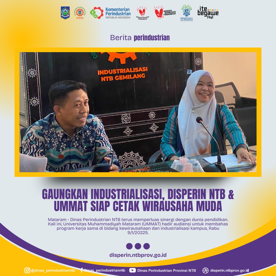 Mataram – Dinas Perindustrian NTB terus memperluas sinergi dengan dunia pendidikan. Kali ini, Universitas Muhammadiyah Mataram (UMMAT) hadir audiensi untuk membahas program kerja sama di bidang kewirausahaan dan industrialisasi kampus, Rabu 9/1/20225.