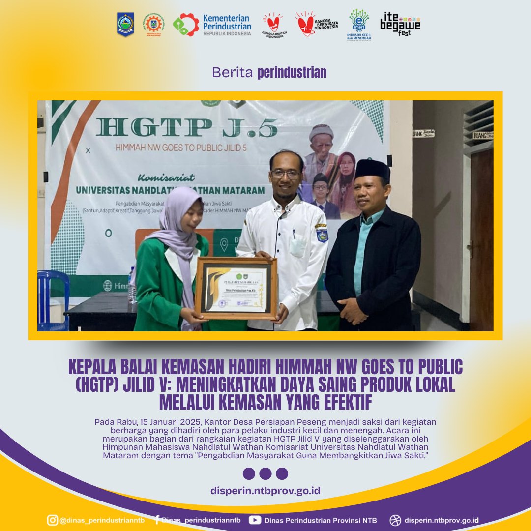 Rabu, 15 Januari 2025. – mewakili Kepala Dinas Perindustrian Provinsi NTB, Nuryanti SE., ME, Plt. Kepala UPTD Balai Kemasan Produk Daerah, Heldy Sardianto, S.T dan Aan Arsyaradani Hidayat , (Desainer) menghadiri kegiatan sebagai narasumber di Himmah NW Goes To Public (HGTP) Jilid V yang di selenggarakan oleh Himpunan Mahasiswa Nahdlatul Wathan Komisariat Universitas Nahdlatul Wathan Mataram dengan tema “Pengabdian Masyarakat Guna Membangkitkan Jiwa Sakti. (Santun, adaptif, kreatif, tanggung jawab dan iman) untuk kader Himmah NW” diselenggarakan dan sekaligus di dampingin oleh Kepala Desa Persiapan Peseng Lalu Agus Rasihun, SIP di Kantor Desa Persiapan Peseng, Dusun Peseng Kecamatan Kopang, Kabupaten Lombok Tengah. Kegiatan dihadiri oleh peserta dari berbagai sektor industri kecil dan menengah.