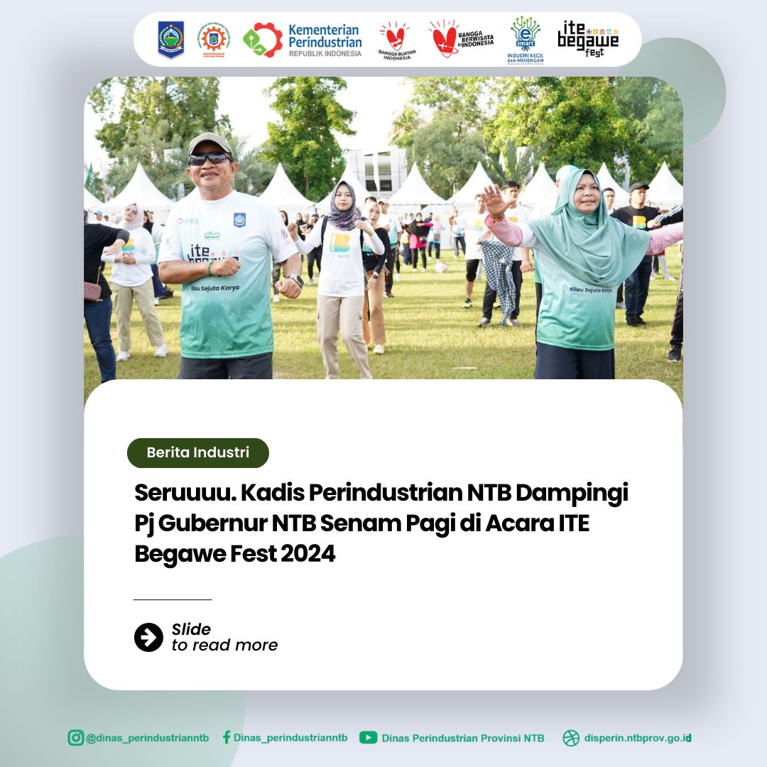 Mataram, 8 Desember 2024 – Kepala Dinas Perindustrian NTB, Nuryanti, SE., ME., mendampingi Penjabat (Pj) Gubernur NTB bersama para kepala OPD lainnya dalam rangkaian kegiatan olahraga pagi pada ITE Begawe Fest 2024 yang berlangsung meriah pada Minggu pagi, 8 Desember 2024.