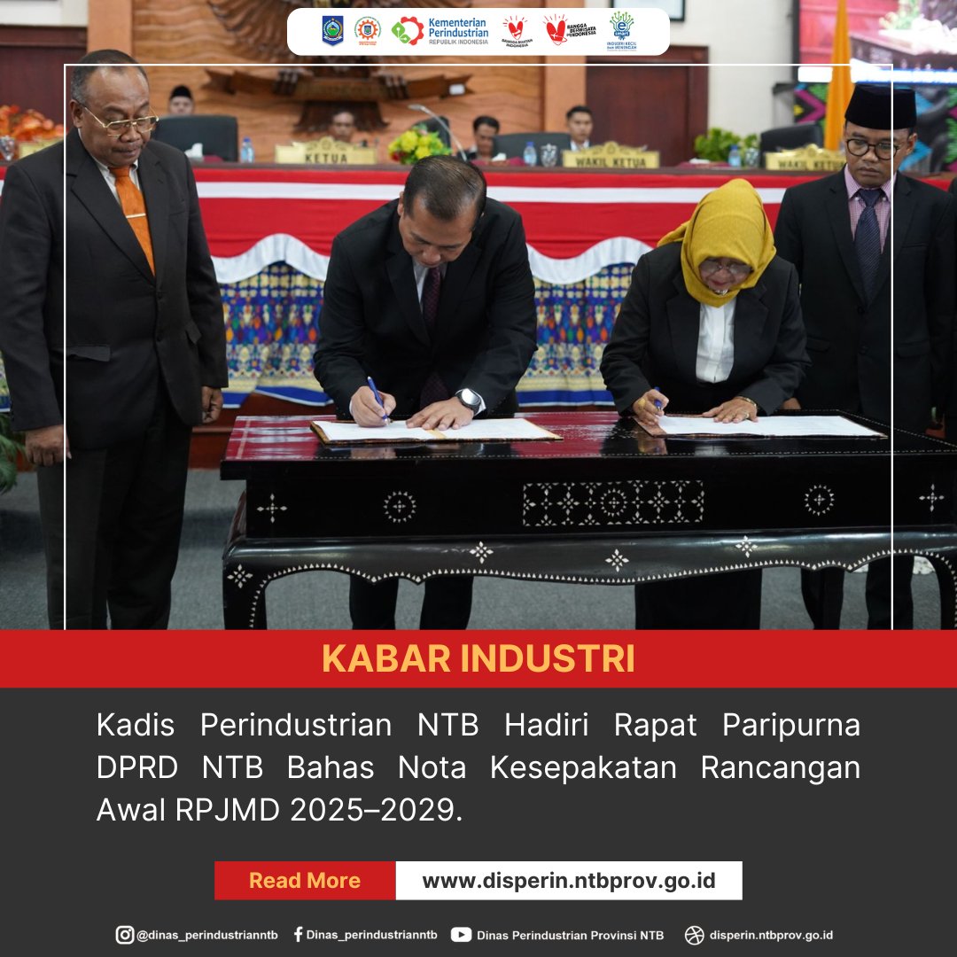 Mataram – Kepala Dinas Perindustrian Provinsi Nusa Tenggara Barat, Hj. Nuryanti, SE., ME, menghadiri Rapat Paripurna DPRD Provinsi NTB yang digelar dalam rangka penandatanganan Nota Kesepakatan Rancangan Awal Rencana Pembangunan Jangka Menengah Daerah (RPJMD) Provinsi NTB Tahun 2025–2029.