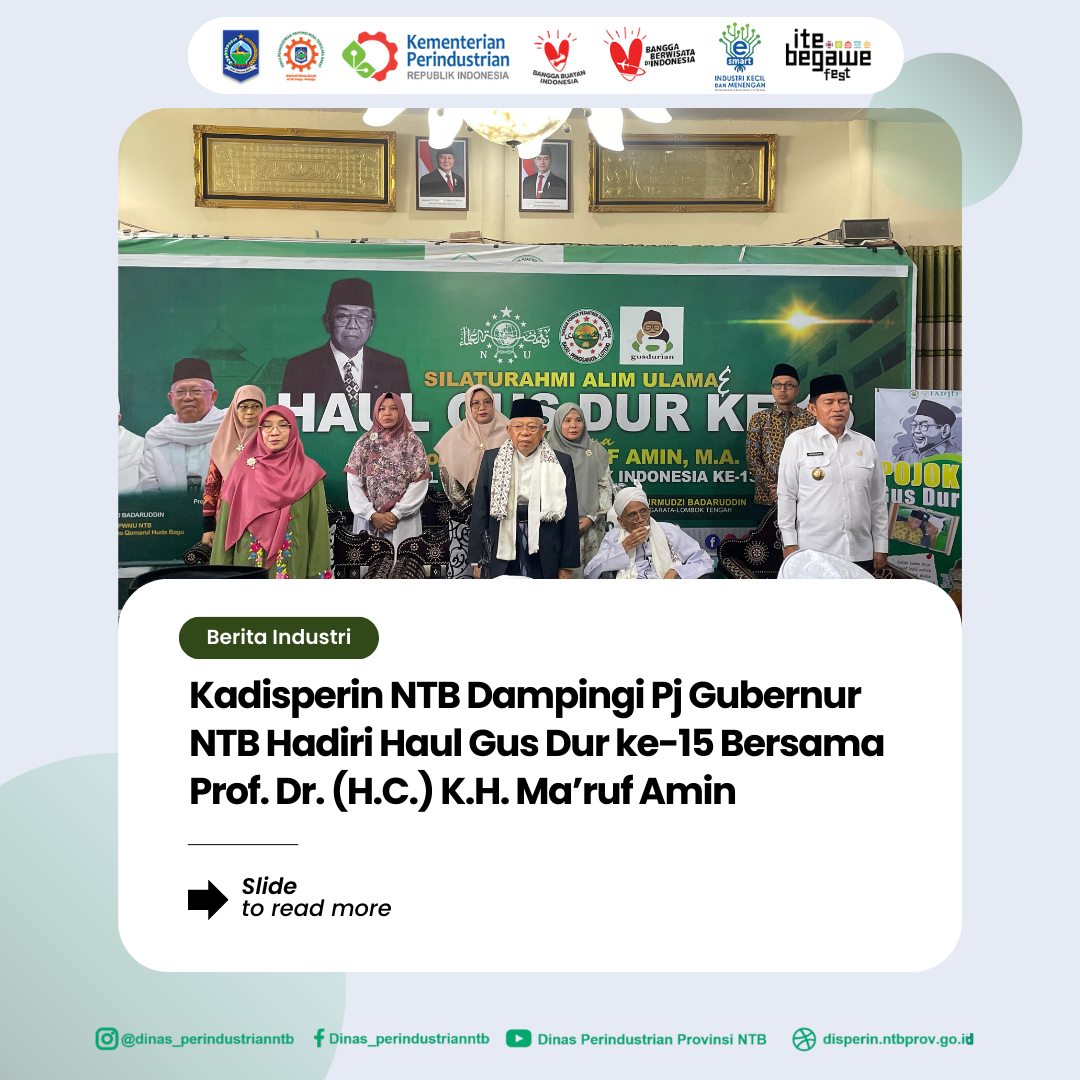 Lombok Tengah, 22 Desember 2024 – Kepala Dinas Perindustrian Nusa Tenggara Barat (Kadisperin NTB), Nuryanti, SE., ME., mendampingi Penjabat (Pj) Gubernur NTB dalam acara Silaturahmi Alim Ulama dan Haul Gus Dur ke-15 yang digelar di Pondok Pesantren Qomarul Huda Bagu, Lombok Tengah.