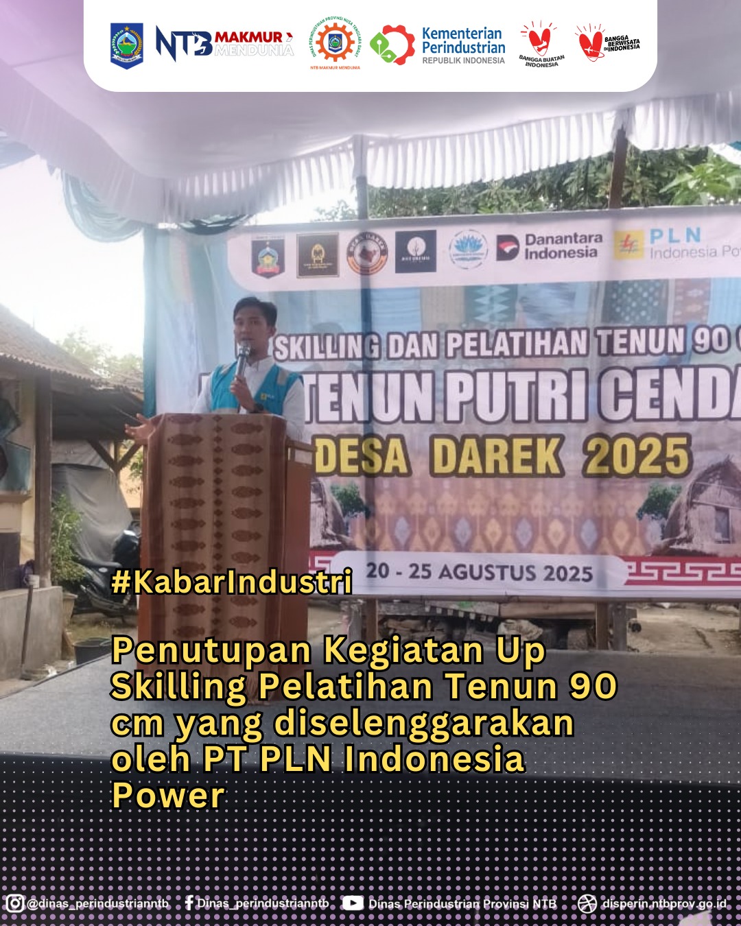 Acara kemudian ditutup secara resmi oleh Kepala Bidang Pemberdayaan Sumberdaya Industri, Bapak Efendi Hidayat. Dalam penyampaiannya, beliau menekankan bahwa kegiatan ini merupakan langkah konkret dalam mendorong kemandirian IKM dan peningkatan daya saing produk tenun lokal. Dengan berakhirnya kegiatan ini bukan berarti seluruh upaya pengembangan berhenti, melainkan menjadi awal dari langkah yang lebih maju untuk terus meningkatkan kualitas, kuantitas, dan kreativitas dalam menenun.Lebih lanjut, beliau menyampaikan harapan agar Desa Darek ke depan dapat memiliki galeri khusus sebagai ruang display tenun. Keberadaan galeri tersebut akan sangat penting, tidak hanya untuk memamerkan hasil karya para penenun, tetapi juga sebagai daya tarik bagi wisatawan yang berkunjung, sehingga tenun Desa Darek semakin dikenal luas dan memiliki nilai tambah dari sisi ekonomi maupun pariwisata.