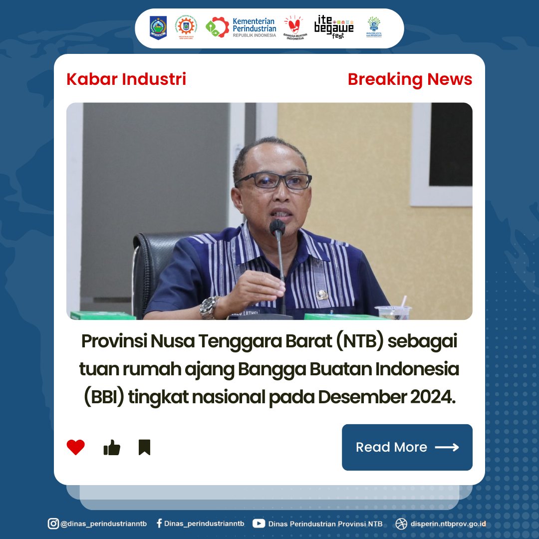 Nasional Bangga Buatan Indonesia (BBI) / Bangga Berwisata di Indonesia (BBWI) dan Produk Dalam Negeri (PDN) 2024, Kementerian Perindustrian Republik Indonesia ditunjuk sebagai Campaign Manager Gerakan Nasional Bangga Buatan Indonesia (Gemas BBI) Tahun 2024. Sebagai rangkaian kegiatan menuju puncak acara Gernas BBI, Provinsi Nusa Tenggara Barat ditetapkan sebagai Co Campaign Manager Gelaran Bangga Buatan Indonesia Tahun 2024 dengan Nama Event “Ite Begawe Fest” dan Tagline “Kilau Sejuta