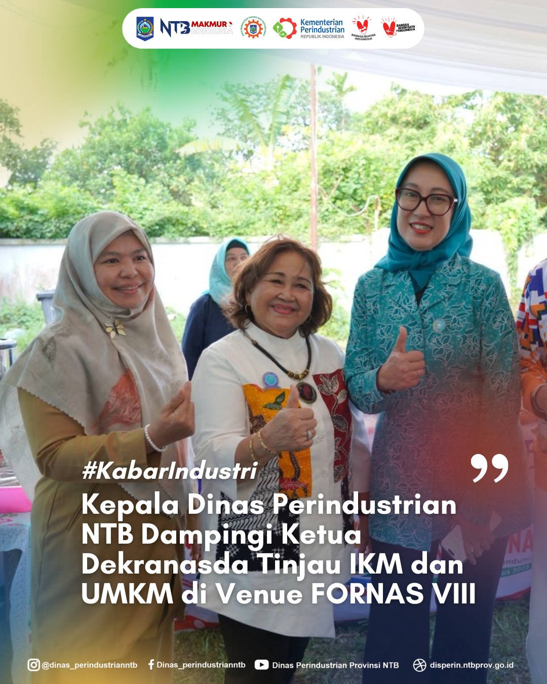Mataram, 29 Juli 2025 – Kepala Dinas Perindustrian Provinsi Nusa Tenggara Barat, Hj. Nuryanti, SE., ME., mendampingi Ketua Dewan Kerajinan Nasional Daerah (Dekranasda) Provinsi NTB, Ny. Sinta M. Iqbal, dalam kunjungan lapangan untuk meninjau pelaku Industri Kecil dan Menengah (IKM) serta Usaha Mikro, Kecil dan Menengah (UMKM) yang turut ambil bagian dalam pelaksanaan Festival Olahraga Rekreasi Nasional (FORNAS) VIII.