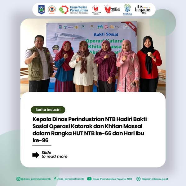 Mataram, 14 Desember 2024 – Kepala Dinas Perindustrian Provinsi NTB, Nuryanti, SE., ME, didampingi Kasubbag Tata Usaha, Indah Wulandari, S.H., turut mendampingi Ketua Dharma Wanita Persatuan (DWP) NTB, Ir. Hj. Lale Prayatni, dalam kegiatan Bakti Sosial Operasi Katarak, Khitan Massal, dan Aksi Simpatik. Acara ini merupakan bagian dari rangkaian peringatan Hari Ulang Tahun (HUT) NTB ke-66 dan Hari Ibu ke-96.