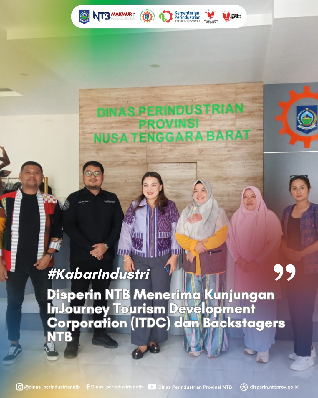 Jum’at 25 Juli 2025 – Kepala Dinas Perindustrian Provinsi NTB Hj. Nuryanti, SE., ME didampingi Kepala Bidang Sarana Prasarana dan Pemberdayaan Industri Hj. DR. Aryanti Dwiyani, S. Pt,. M. Pd dan Fungsional Pembina Industri Misbah Ali Astanugraha, ST., MM menerima kunjungan Made Purnama Damayanti beserta Bu Keiko dan Pak Ricki dari InJourney Tourism Development Corporation (ITDC) dan Lalu Rio Teguh dari Backstagers NTB. Poin – poin pada pertemuan ini adalah :