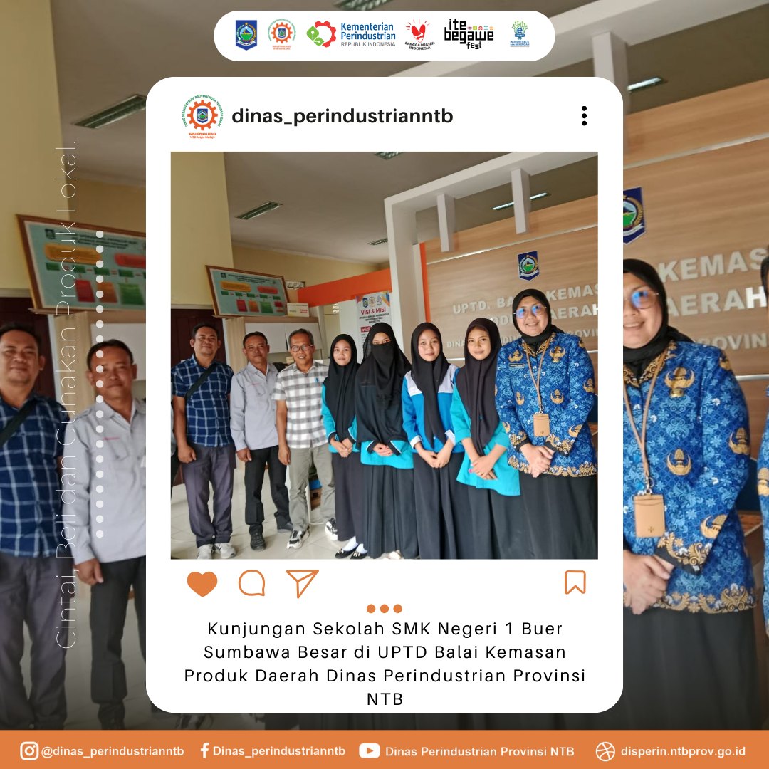 Kunjungan Kepala Sekolah SMK Negeri 1 Buer Adirmawan, S.Pd didampingi Wakil Kepala Sekolah SMK Negeri 1 Buer Sumbawa Besar di UPTD Balai Kemasan Produk Daerah Dinas Perindustrian Provinsi NTB pada Kamis, 17 Oktober 2024. Kunjungan ini dalam rangka rencana penandatanganan MoU antara SMK Negeri 1 Buer dan UPTD Balai Kemasan Produk Daerah Dinas Perindustrian Provinsi NTB sekaligus melakukan monitoring terhadap 4 siswi yang sedang melaksanakan PKL/ Magang di Balai Kemasan.