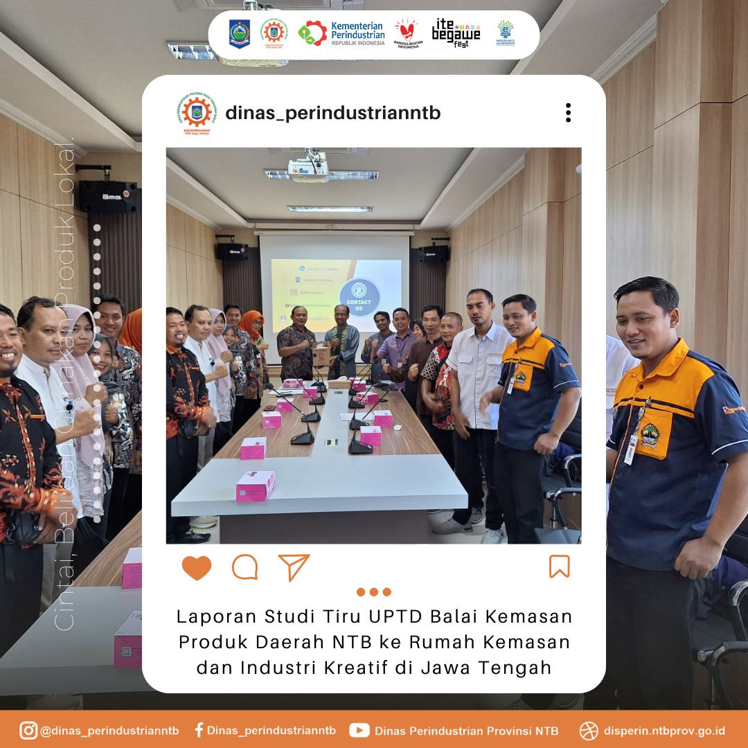 Jawa Tengah, 25 Oktober 2024 – Hari ini, tim Dinas Perindustrian Provinsi NTB bersama UPTD Balai Kemasan Produk Daerah melakukan kunjungan studi tiru ke Rumah Kemasan dan Industri Kreatif di Provinsi Jawa Tengah. Kegiatan ini bertujuan memperkuat sektor UMKM dengan mengutamakan inovasi dalam kemasan produk sebagai salah satu faktor peningkatan daya saing.