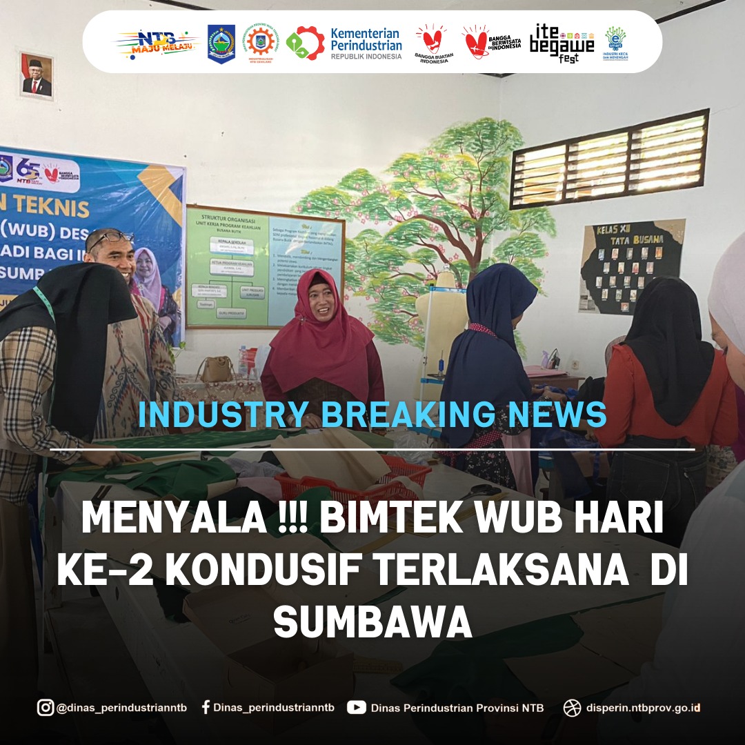 Sebagai rangkaian Gerakan Nasional Bangga Buatan Indonesia (BBI) dan Bangga Berwisata di Indonesia (BBWI), Pelaksanaan Bimtek Wirausaha Baru (WUB) Tahun 2024 di Sumbawa memasuki hari ke dua . Pada tahapan ini peserta yang dikelompokkan menjadi 3 tim ini sudah mulai menjahit kain yang dihari pertama sudah dibentuk pola dan desainnya.