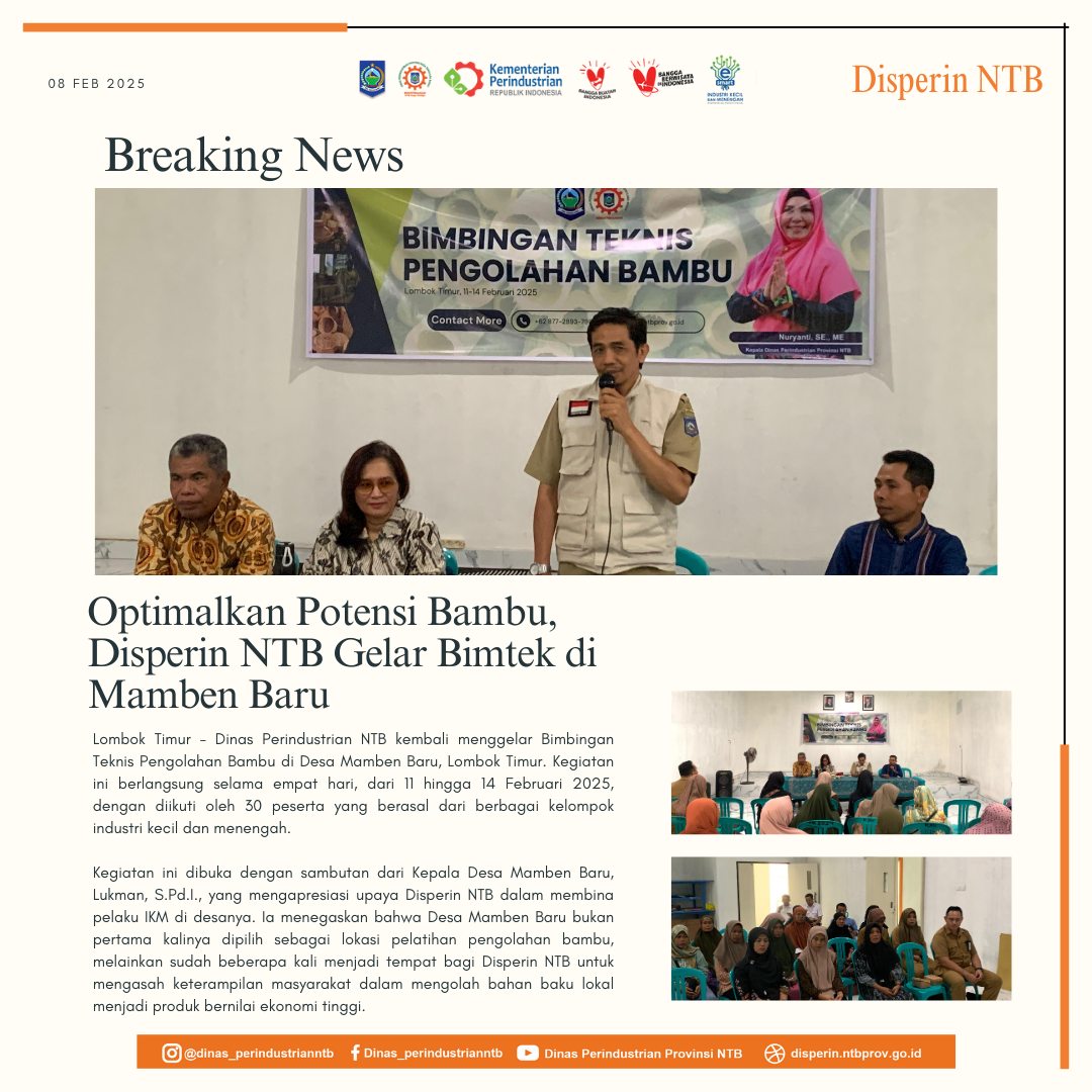 Kegiatan ini dibuka dengan sambutan dari Kepala Desa Mamben Baru, Lukman, S.Pd.I., yang mengapresiasi upaya Disperin NTB dalam membina pelaku IKM di desanya. Ia menegaskan bahwa Desa Mamben Baru bukan pertama kalinya dipilih sebagai lokasi pelatihan pengolahan bambu, melainkan sudah beberapa kali menjadi tempat bagi Disperin NTB untuk mengasah keterampilan masyarakat dalam mengolah bahan baku lokal menjadi produk bernilai ekonomi tinggi.
