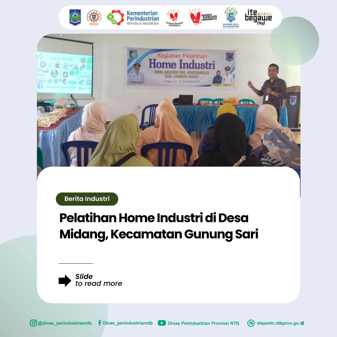 Mewakili Kepala Balai Kemasan Produk Daerah Dinas Perindustrian Provinsi NTB, Tim UPTD Balai Kemasan Produk Daerah Dinas Perindustrian NTB, Zahrul Martayadi, S.STP dan Baiq Ema Bini Novelia, ST, menjadi narasumber dalam kegiatan Pelatihan Home Industri yang berlangsung di Desa Midang, Kecamatan Gunung Sari, Kabupaten Lombok Barat, pada 19-20 Desember 2024.