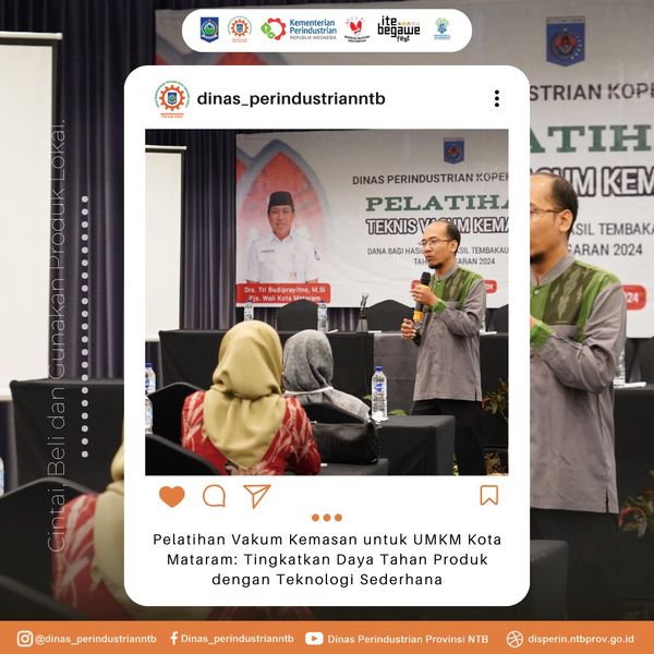 Plt Kepala Balai Kemasan Heldy Sardianto, ST dan Tim menghadiri kegiatan sebagai Narasumber pada Pelatihan Vakum Kemasan yang bertempat di Hotel Fave Mataram 1-4 Oktober 2024. Kegiatan yang diselenggarakan oleh Dinas Perindustrian Koperasi UKM Kota Mataram ini dihadiri oleh 30 peserta UMKM se-Kota Mataram. Adapun berbagai produk UMKM yang mengikuti pelatihan diantaranya Sate Pusut, Ayam Betutu, serta beberapa olahan daging dan ayam.
