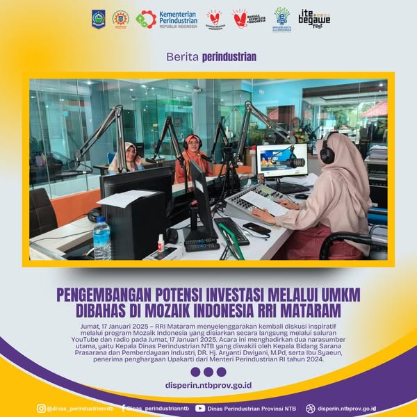 Jumat, 17 Januari 2025 – RRI Mataram menyelenggarakan kembali diskusi inspiratif melalui program Mozaik Indonesia yang disiarkan secara langsung melalui saluran YouTube dan radio pada Jumat, 17 Januari 2025. Acara ini menghadirkan dua narasumber utama, yaitu Kepala Dinas Perindustrian NTB yang diwakili oleh Kepala Bidang Sarana Prasarana dan Pemberdayaan Industri, DR. Hj. Aryanti Dwiyani, M.Pd, serta Ibu Syaeun, penerima penghargaan Upakarti dari Menteri Perindustrian RI tahun 2024.