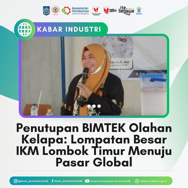 Lombok Timur, 20 Juli 2024 – Setelah berlangsung selama tiga hari, kegiatan Bimbingan Teknis (BIMTEK) Wirausaha Baru (WUB) Olahan Kelapa bagi Industri Kecil dan Menengah (IKM) di Kabupaten Lombok Timur resmi ditutup. Penutupan acara ini dilakukan langsung oleh Kepala Dinas Perindustrian Provinsi NTB, Ibu Hj. Nuryanti, S.E, M.E.