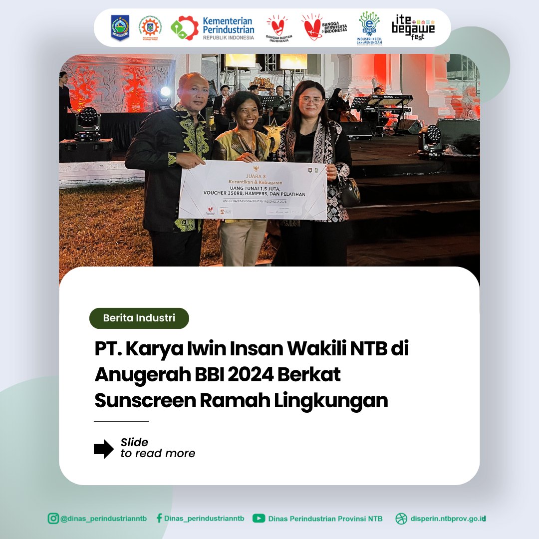 Banyuwangi – PT. Karya Iwin Insan, salah satu Industri Kecil Menengah unggulan asal NTB, kembali mengukir prestasi membanggakan. Dengan produk inovatifnya, Sunscreen Ramah Lingkungan, IKM ini dinobatkan sebagai salah satu pemenang IKM Champion Bangga Buatan Indonesia (BBI) NTB 2024. Prestasi tersebut sekaligus mengantarkan PT. Karya Iwin Insan mewakili NTB dalam ajang bergengsi Program Anugerah Bangga Buatan Indonesia 2024.