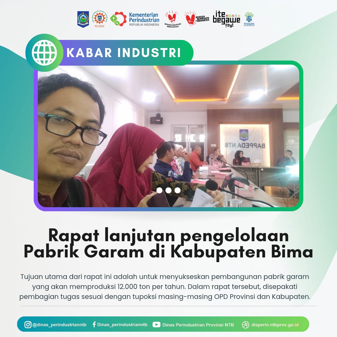 Mataram – Pembina Industri Bahrul Helmi, SH, mewakili Kepala Dinas Perindustrian NTB menghadiri lanjutan rapat di kantor Badan Perencanaan Pembangunan Daerah (Bappeda) NTB terkait pengelolaan pabrik garam di Kabupaten Bima.
