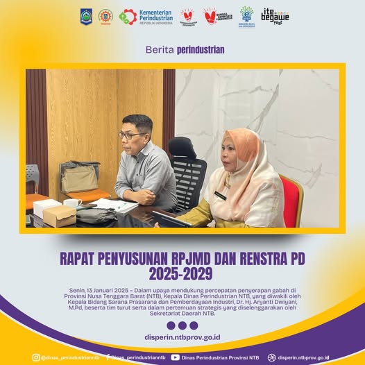 Mataram – Kepala Dinas Perindustrian Provinsi Nusa Tenggara Barat (NTB), Nuryanti, SE., ME., didampimgi Eselon III dan Fungsional Perencana menghadiri rapat orientasi penyusunan Rencana Pembangunan Jangka Menengah Daerah (RPJMD) dan Rencana Strategis Perangkat Daerah (Renstra PD) 2025-2029. Kegiatan ini berlangsung di ruang rapat Bappeda NTB pada Selasa, 14 Januari 2025.