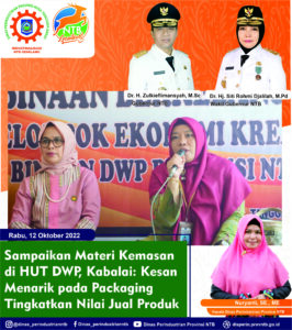 Mewakili Kepala Dinas Perindustrian Provinsi NTB, Kepala Balai Kemasan Produk Daerah Aryanti Dwiyani, M.Pd didampingi Staff UPTD BKPD, Voxcy menjadi Narasumber pada Kegiatan HUT DWP ke 23 Tahun 2022 dengan materi tentang “Cara Pengepakan, Kemasan dan Label” di Kantor Bangsal Pengolahan Kota Mataram (11/10/2022).