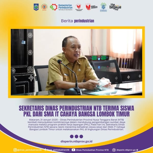 Mataram, 21 Januari 2025 – Sekretaris Dinas Perindustrian Provinsi NTB menerima kedatangan siswa Praktek Kerja Lapangan (PKL) dari SMA IT Cahaya Bangsa, Lombok Timur. Kegiatan ini merupakan bagian dari program pembelajaran berbasis praktik yang bertujuan untuk memberikan pengalaman langsung kepada siswa mengenai dunia kerja, khususnya di bidang industri.