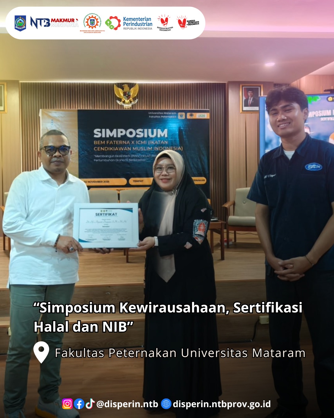 Fakultas Peternakan Universitas Mataram menyelenggarakan Simposium Kewirausahaan, Sertifikasi Halal dan Nomor Induk Berusaha (NIB) sebagai upaya menumbuhkan semangat kewirausahaan berbasis nilai-nilai halal di kalangan mahasiswa dan pelaku usaha industri kecil menengah (IKM). Kegiatan ini berlangsung dengan penuh antusias di Ruang Serba Guna Gedung A Lantai 1 Fakultas Peternakan Universitas Mataram. (Minggu, 2 November 2025)