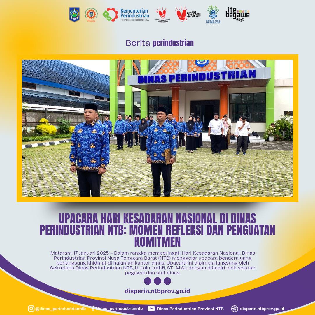 Mataram, 17 Januari 2025 – Dalam rangka memperingati Hari Kesadaran Nasional, Dinas Perindustrian Provinsi Nusa Tenggara Barat (NTB) menggelar upacara bendera yang berlangsung khidmat di halaman kantor dinas. Upacara ini dipimpin langsung oleh Sekretaris Dinas Perindustrian NTB, H. Lalu Luthfi, ST., M.Si., dengan dihadiri oleh seluruh pegawai dan staf dinas.