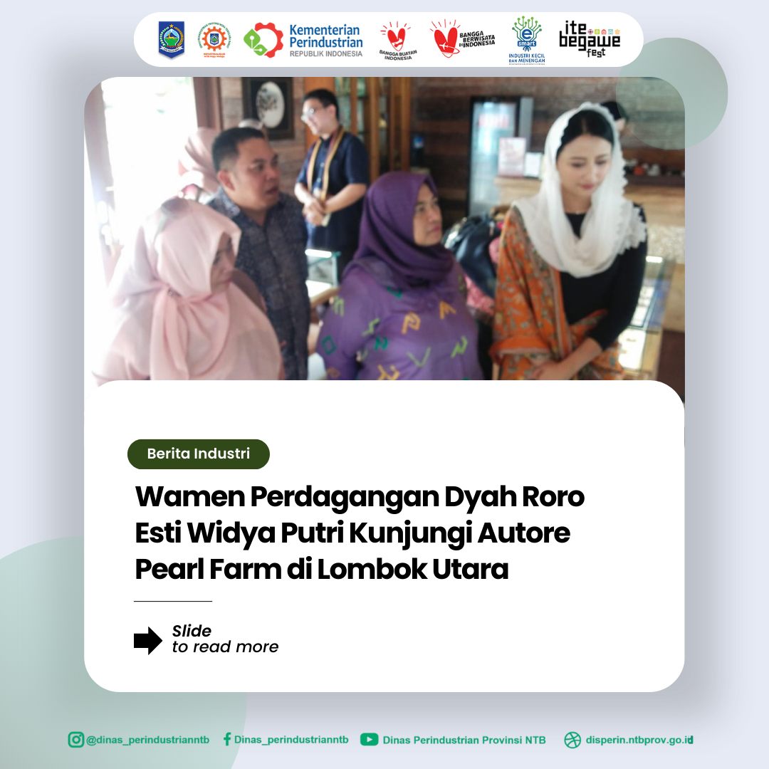 Lombok Utara, 14 Desember 2024 – Wakil Menteri Perdagangan, Dyah Roro Esti Widya Putri, melakukan kunjungan kerja ke Autore Pearl Farm, salah satu eksportir mutiara terkemuka yang berlokasi di Pamenang, Lombok Utara. Kedatangan Wamen Perdagangan disambut langsung oleh Bupati Lombok Utara dan Kepala Dinas Perdagangan NTB. Dalam kesempatan ini, Dinas Perindustrian NTB juga turut hadir, diwakili oleh Pejabat Fungsional Pembina Industri, Ety Hartati.